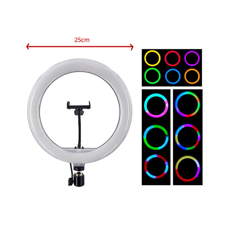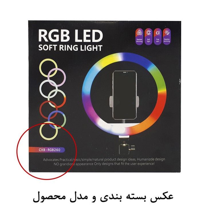 این رینگ لایت با قطر 26 سانتی متر و دارای رنگ های آفتابی ، مهتابی و همچنین با قابلیت تنظیم 12 رنگ RGB مناسب عکاسی پرتره و مدلینگ،ساخت ویدئو کلیپ های جذاب و حتی Light Painting یا نقاشی با نور است. از مهم ترین قابلیت های این رینگ لایت می توان به تنظیم رنگ نور در 3 حالت تک رنگ،چشمک زن و چرخش هفت رنگ RGB آن اشاره کرد.به این صورت که 7 رنگ RGB به صورت دوار بر روی رینگ لایت نمایش داده می شود. رینگ لایت هفت رنگ CXB RGB 260 با قدرت 20 وات از طریق پورت USB استفاده می گردد.تنظیمات این رینگ لایت از طریق کنترل روی کابل USB آن انجام می گردد.این کنترلر دارای دکمه ی روشن خاموش،دکمه ی Mode (تنظیم حالت انتخابی رنگ)،دکمه ی کم و زیاد کردن قدرت خروجی از 0 تا 100% است. همراه این رینگ لایت یک عدد هولدر موبایل قابل انعطاف ارائه می گردد.