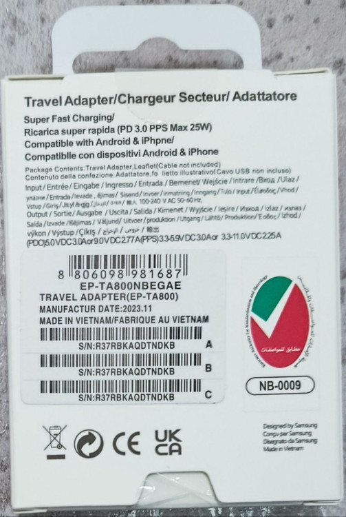 شارژر دیواری سامسونگ EP-TA۸۰۰ برای شارژ سریع تا ۲۵W را برای دستگاههای سازگار فراهم می کند. برای نتیجه بهینه از شارژر دیواری با کابل شارژ رسمی سامسونگ Type C به Type C استفاده کنید. که بایستی به طور جداگانه تهیه شود.